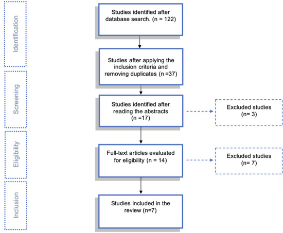 The initial search yielded 122 articles. After applying the inclusion criteria and eliminating duplicate entries, the selected studies were 37. After reading the abstracts, 17 studies were selected and finally, after the full reading of the articles, only 7 fulfilled the criteria (Figure 1). The data obtained is summarized in Table 1.