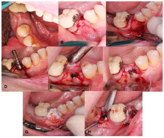 (A) Preoperative occlusal view; (B) Incision; (C) flap detachment; (D) Drilling according to protocol, check the position with the pin; (E) Implant placement at level 45; (F) Micro perforations in the vestibular; (G) Placement of Bond Apatite®; (H) Tension suture and implant placement in 47.