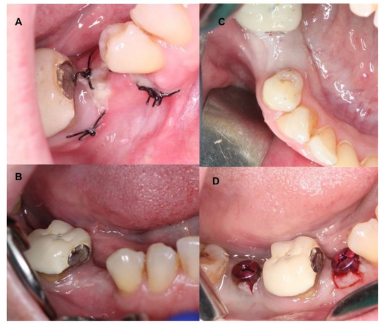 (A) Follow-up and removal of the suture after 7 days; (B) 1 month follow-up; (C) 2 months follow-up; (D) 3 months follow-up and healing abutments’ placement.
