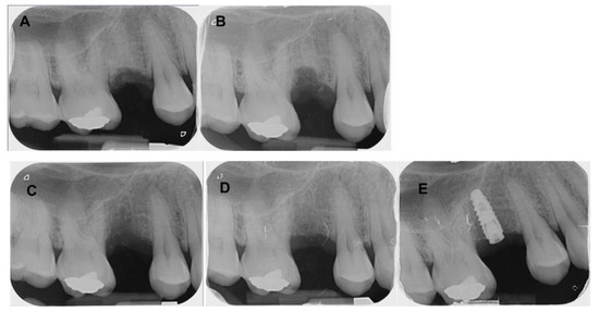 (A) Immediate postoperative periapical; (B) One week IOPA; (C) One month IOPA; (D) Two months IOPA; (E) IOPA after implant placement.