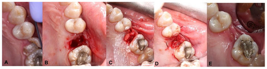 (A) Preoperative occlusal view; (B) Dental extraction of 25; (C) Placement of Bond Apatite®; (D) Postoperative occlusal view; (E) One-week follow-up.
