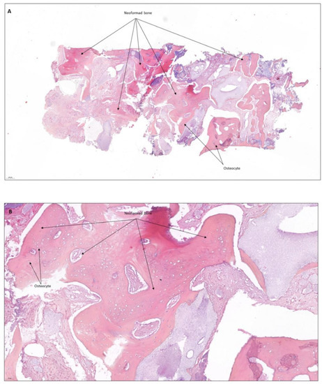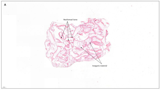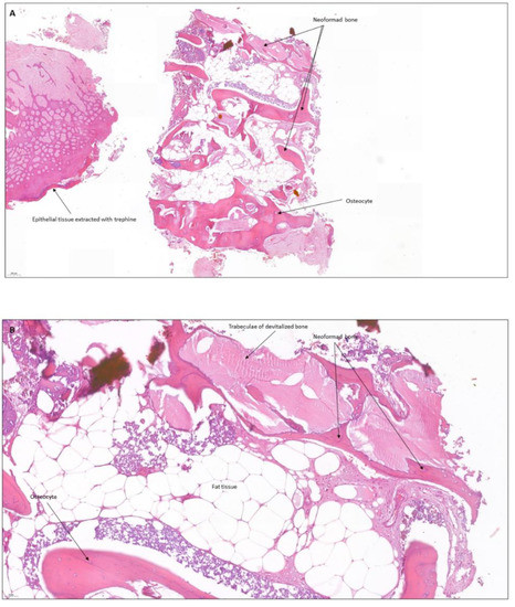 A 52-year-old man with no known allergies or medical or toxicological history of interest came to the clinic to assess the extraction of the 15 root remnant (Figure 5A) and placement of an implant. The case was assessed and, as there was not enough apical bone (Figure 6A), the possibility of placing an implant immediately after extraction was ruled out; it was decided to perform alveolar preservation after extraction and placement of the implant in a second surgical phase. We proceeded to the extraction of 15 and alveolar preservation with Bond Apatite® according to the manufacturer’s protocol, extraction, curettage of the alveolus, placement of a Bond Apatite® syringe, compression with dry and sterile gauze, coverage with a collagen sponge and point of cross suture (Figure 7). There were no intraoperative complications. The recommendations and postoperative pharmacological guidelines were delivered. A week later, the patient attended suture removal reporting considerable pain. On examination, alveolitis and loss of graft material were observed, so the medication was changed to Amoxicillin/Clavulanic Acid 875/125 mg every 8 h × 7 days, Dexketoprofen 25mg every 8 h alternated with Metamizole 575 mg every 8 h if there was pain. Periodic monthly follow-ups were carried out (Figure 5B,C) and at 4 months a new CBCT of the area was requested (Figure 6B) for implant planning, where good healing and maintenance of bone volume were observed. On the day of surgery, a trephine biopsy was taken in the regenerated area for histopathological analysis (Figure 8) and a 3.5 × 10 mm Microdent® Genius implant was placed following the milling protocol of the commercial house (Figure 5D). The same pharmacological regimen was prescribed as on the day of the extraction and monthly follow-up visits were scheduled. Currently, he must undergo the second surgical phase and subsequent prosthodontic rehabilitation.