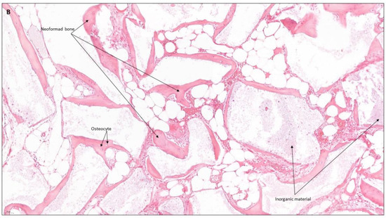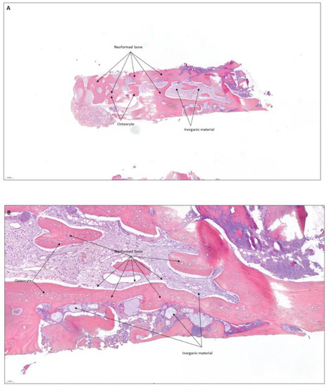 (A) Remains of inorganic material with newly formed bone trabeculae in (A) at 50× and in (B) at 200×. Total bone length of 5.97 mm and newformed bone of 2.98 mm.