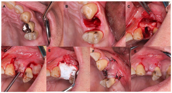 (A) Preoperative occlusal view; (B) Dental extraction of 24; (C) Mucoperiosteal flap; (D) Passivity check; (E) Placement of Bond Apatite®; (F) Closing by the first intention; (G) One-week follow-up.