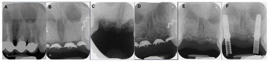 (A) Preoperative IOPA; (B) Immediate postoperative IOPA; (C) One week IOPA; (D) One month IOPA; (E) Two months IOPA; (F) IOPA after implant placement.