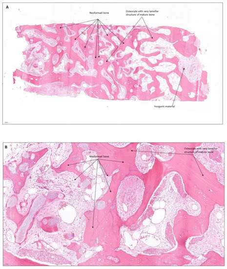 Few remains of inorganic material and abundant newly formed bone. (A) at 50× and (B) at 200×. Total bone length 6.63 mm, and clearly newformed bone indistinguishable from the rest 3.53 mm.