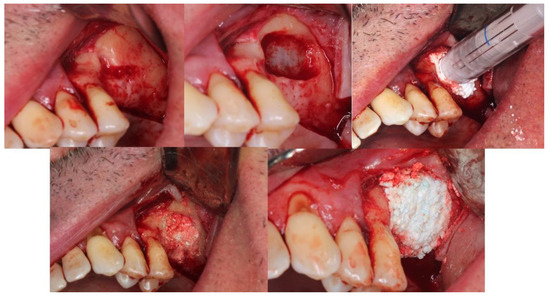Bond Apatite® is presented as a powder in a double barrel syringe and a sodium chloride solution. With the help of a piston, the solution is poured over the powder, obtaining a mixture that can be easily deposited in the bone deficit, since the resulting product is adhesive. Subsequently, pressure must be exerted with a dry sterile gauze for a few seconds, thus eliminating excess liquid and favoring the setting of the product. In addition, the manufacturer recommends closing the flap under tension and it is not necessary to cover the graft with any type of membrane, since when it hardens it acts as a barrier preventing the penetration of epithelial–connective cells [25,26].