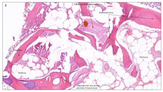 Abundant newly formed bone and some trabeculae of devitalized bone in (A) at 50× and in (B,C) at 200×. Total bone length of 3.56 and newly formed bone of 3.01 mm.