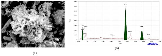 The microstructure of W-substituted ZnFe2O4 has been analyzed with the scanning electron microscopic technique for ZnFe2−2xWxO4 (0.0 ≤ x ≤ 0.15), as depicted in Figure 2. Energy-dispersive X-ray spectroscopy was also performed to analyze the elements present in ZnFe2−2xWxO4 (0.0 ≤ x ≤ 0.15), as exhibited in Figure 2.