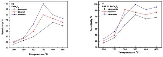 Ferrite sensor sensitivity to ammonia, ethanol, and acetone at different temperatures (gas concentration of 2000 ppm); (a) ZnFe2O4, (b) ZnW0.05Fe1.95O4, (c) ZnW0.1Fe1.90O4, and (d) ZnW0.15Fe1.85O4.