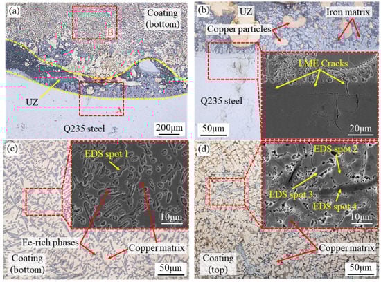 Figure 2 shows the microstructure of coating 1. EDS spot analysis results of spots 1–4 in Figure 2 are shown in Table 3. Figure 2a shows the microstructure of the copper–steel interface. A UZ with a width of about 100–400 μm between the coating and the substrate can be seen, where copper particles of different shapes were found. Figure 2b shows an enlarged view of the UZ–substrate interface in region A of Figure 2a. LME cracks were found at the interface, which adversely affected the bonding strength of the interface. Figure 2c shows a local magnification of region B at the bottom of coating 1 in Figure 2a. It can be seen that a large number of dendritic and equiaxed Fe-rich phases were distributed on the copper matrix (spot 1 in Table 3). The Fe-rich phases formed by the solidification of Fe diffused from the steel into the molten pool. Figure 2d shows the microstructure at the top of coating 1, which is mainly composed of dendrites and a few cellular crystals. The EDS analysis result of spot 2 shows that it is a copper-based solid solution. In addition, there are two kinds of gray phases distributed in the intergranular space. One of them is dendritic with equiaxed light-gray Fe-rich phases (spot 3 in Table 3). The other shows some dark-gray rod-like phases. EDS analysis of spot 4 shows that the dark-gray phases are TiC generated by the in situ reaction of Ti and C, which can enhance the coatings. In general, coating 1 was defect-free, except for LME cracks at the copper–steel interface.