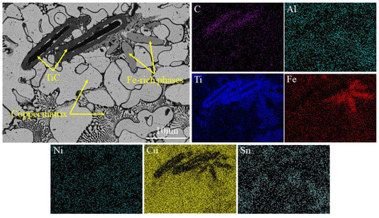 In order to more intuitively characterize the composition distribution at the top of coating 1, the BSE mode of the scanning electron microscope was used to observe the framed selection region in Figure 2d, and the element distribution in this region was analyzed, as shown in Figure 3. The element maps show that the distribution of Ti overlapped with C and Fe, respectively. This indicates that a part of Ti was enriched in the Fe-rich phases, and the other part of Ti reacted with C to generate TiC. The top of coating 1 mainly consists of copper matrix, Fe-rich phases, and TiC reinforcements. As the atomic number of elements in the BSE image is larger, the corresponding color is lighter. Therefore, the large white area in the BSE image is copper matrix, the light-gray dendritic and equiaxed areas are Fe-rich phases, and the dark-gray rod-like phases are TiC, which is the same as the EDS spot analysis results.