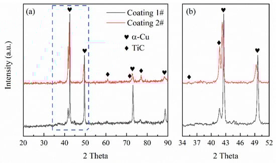 Figure 6 shows the XRD patterns of coatings 1 and 2. Figure 6a shows the complete XRD patterns, and Figure 6b shows the enlarged view of the selected region in Figure 6a. According to the patterns in Figure 6a, the composite coatings are mainly composed of α-Cu solid solution and TiC. TiC was formed by the in situ reaction of Ti and C in the molten pool. No diffraction peaks of the Fe-rich phase were found in the figure, which may be related to its low content in two coatings. With the addition of the interlayer, the diffraction peaks of α-Cu shifted to a smaller angle (Figure 6b). This is because part of Ni from the Cu-Ni-Ti interlayer was dissolved in the α-Cu matrix of coating 2, which increases the lattice constant of copper.