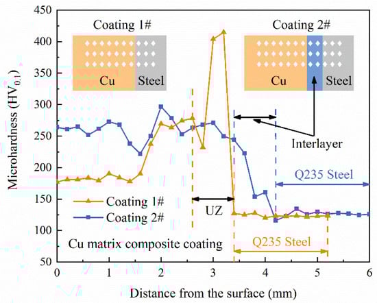 The microhardness of coatings 1 and 2 along the cross section is shown in Figure 8. Each hardness value shown in Figure 8 was an average value of three points. The hardness of both coatings is higher than that of the substrate, which indicates that the copper matrix composite coatings designed in this study can effectively improve the surface hardness of Q235 steel. The hardness distribution from the substrate to the coatings shows a trend from low to high in general, but the two curves are different in details. Obviously, this difference is related to the effect of the interlayer. The hardness of coating 1 fluctuates greatly, and the highest hardness is located in the UZ, which is about 414.9 HV0.1. In coating 1, the hardness at the bottom of the coating is higher than that at the top, which is related to the diffusion distance of Fe. The farther from the interface, the lower the hardness of the coating due to the less Fe diffused. The hardness of the bottom and top of the coating is basically the same in coating 2 with the interlayer added, because Ni can promote the diffusion of Fe to the top of the coating. In addition, the diffusion of Ni into the coating can also play a role in solid-solution strengthening, which is beneficial to improving the hardness of the coating. There is no abrupt change in hardness at the interface in coating 2, and the hardness transition was relatively smooth. A continuous gradient transition of hardness is realized, and the stress concentration at the interface can be effectively relieved. Therefore, the Cu-Ni-Ti interlayer can significantly improve the hardness distribution characteristics of the copper–steel interface, and achieve a good transition at the bimetallic interface.