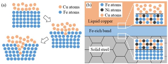 Figure 12a shows the formation mechanism of LME cracks at the copper–steel interface. During the arc cladding process, when the temperature is higher than the melting point of copper but lower than that of iron, liquid copper tends to wet the austenite grain boundaries of steel because of the small dihedral angle (about 18°) between liquid copper and solid iron [38]. Driven by the difference in electronegativity, charges transfer from Fe atoms to Cu atoms, thereby weakening the Fe-Fe bonds within the austenite grain boundaries. This leads to the reduction of critical stress required for grain boundary cracking, which makes it easier to crack [39]. Then, the LME cracks are formed at the grain boundaries of steel when the thermal stress exceeded the critical stress. After adding the interlayer, no LME cracks were found at the interface, as shown in Figure 4a. The result shows that Ni can inhibit the formation of LME cracks, which is consistent with the results of [24,40]. The inhibition of Ni on LME cracks at the copper–steel interface is related to the interface structure, as shown in Figure 12b. Near the interface, the Fe-rich phases in the interlayer first solidified in a planar crystal manner. As a result, an Fe-rich band was formed, which is essentially a solid solution formed by Fe, Ni, Cu, and a few other elements. From the element maps in Figure 11b, it can be seen that Cu in the interlayer mainly exists in the intergranular of the Fe-rich phases, and the content in the Fe-rich phases is less. Therefore, the Fe-rich band at the interface acted as a barrier between the steel substrate and the copper-rich liquid. This reduces the possibility of LME cracking because the number of liquid Cu atoms contacting with the solid-steel matrix was greatly reduced. In the following study, we will characterize the microstructure of the Fe-rich band in more detail and further explore the mechanism of Fe-rich bands inhibiting LME cracks.