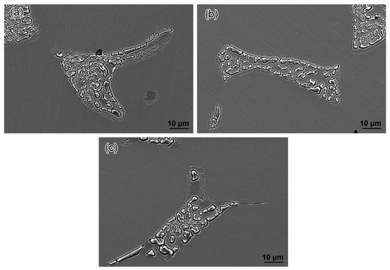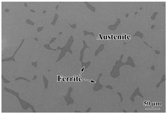 The studied stainless steel was cut from a piece of a primary coolant pipe. Its chemical composition is listed in Table 1. The pipe was fabricated first by electric-arc and argon–oxygen decarburization melting and then by sand casting and solution treatment (1180 °C, 8 h), followed by water quenching. The microstructure of the as-received Z3CN20.09M CASS is shown in Figure 1. As-received specimens were first isothermally aged at 750 °C for 0–200 h in a resistance furnace, followed by water quenching, and were then cut into different shapes and sizes for the microstructural examination and tensile tests.