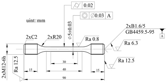 The volume fractions of the sigma phases were estimated based on a counting analysis of the 20 scanning electron microscopy micrographs of the specimens for each condition in a quantitative metallography analysis software (Image-Pro Plus6.0, Media Cybernetics, Rockville, MD, USA). Cylindrical specimens with a diameter of 5 mm and a gage length of 25 and 30 mm, as shown in Figure 2 and Figure 3, were machined for room- and moderate-temperature tensile tests, respectively. The room-temperature tensile tests were performed by a CMT4105 tensile testing machine (MTS-SANS, Shenzhen, China) with a strain rate of 1 × 10−3 s−1. Moderate-temperature tensile tests were conducted at 350 °C on a DDL50 testing machine (Sinotest, Changchun, China) at an initial strain rate of 1 × 10−3 s−1.