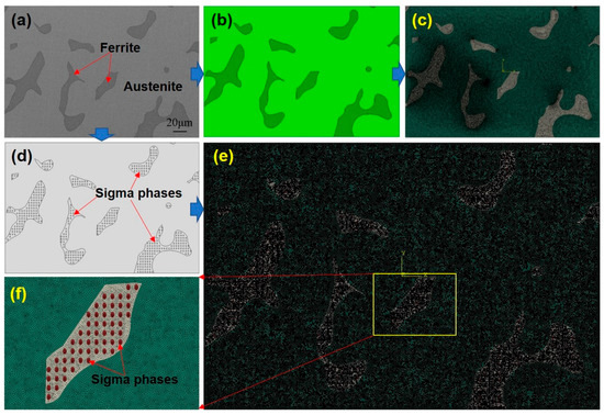 Geometrical and meshed models for ABAQUS finite element software calculating unaged specimens (a–c) without sigma phases and aged specimens with sigma phases. (d) model diagram of calculation; (e) grid division diagram; (f) higher magnification image of localized frame in (e).