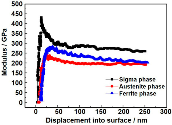 Moduli of sigma, austenite, and ferrite phases in aged Z3CN20.09M specimens at 750 °C for 200 h examined by nanoindentation.