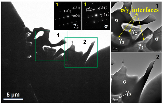 TEM images of the sigma phase in Z3CN20.09M specimens aged at 750 °C for 200 h, with the corresponding selected area electron diffraction patterns in the insets.