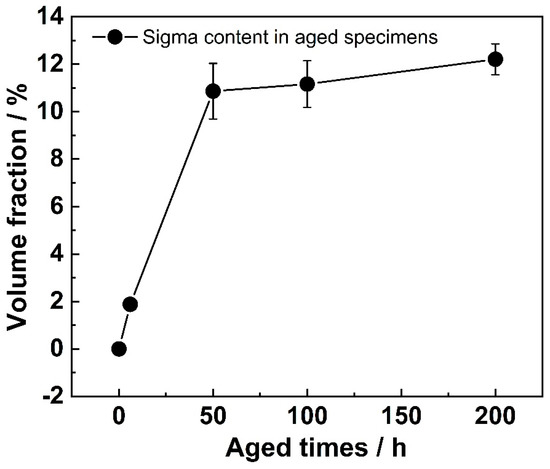 Figure 6 shows the microstructures of Z3CN20.09M specimens aged at 750 °C for 0–200 h. Many sigma phases precipitated in the aged specimens when aging time exceeded 50 h. The morphology and structure of the sigma can be seen in the TEM images and diffraction pattern, as shown in Figure 7, showing a tetragonal structure. The content of the sigma phases in aged Z3CN20.09M specimens increased with increasing aging time. However, no significant increase in sigma phase content was seen when aging time exceeded 50 h, as shown in Figure 8. This means that the precipitation of the sigma phase in specimens aged at 750 °C for 50 h has almost been completed and only a coarsening of the phase takes place for long durations of aging, from 50 to 200 h. The higher magnification SEM images displayed larger sigma particles with increased aging time, as shown in Figure 9. The formation of a sigma phase occurs through the eutectoid decomposition of ferrite α→σ + γ2, which is affected by the composition of the steel and the concentration of Cr in the ferrite and austenite phases. A previous study showed maximum kinetics during the precipitation of the sigma phases in the Z3CN20.09M specimens aged at 750 °C, with the fastest precipitation velocity for sigma phases occurring at 750 °C [22]. Therefore, the precipitation of sigma is possible in Z3CN20.09M specimens aged at 750 °C for 50 h.