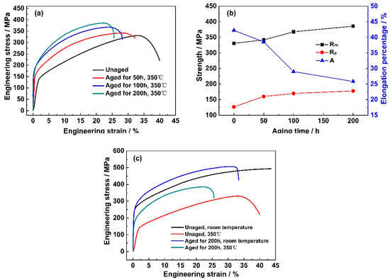 Engineering stress–strain curves of Z3CN20.09M specimens tested at 350 °C (a), the relationship between strength, elongation, and aging times (b), and engineering stress–strain curves of unaged and aged Z3CN20.09M specimens at room temperature and 350 °C (c).