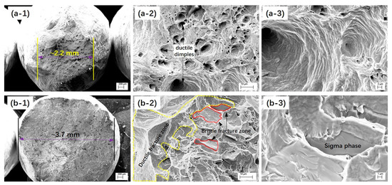 Tensile fracture surfaces of Z3CN20.09M specimens unaged (a) and aged at 750 °C for 200 h (b); 1—low magnification, 2—moderate magnification, and 3—high magnification.