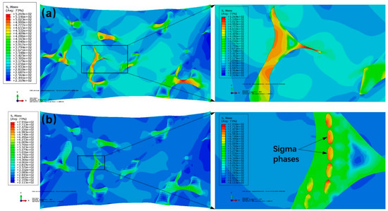 Calculated results of stress distribution in Z3CN20.09M specimens without (a) and with (b) sigma phases under tensile tests.
