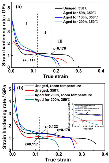 Strain-hardening rate of aged and unaged Z3CN20.09M specimens at different temperatures: (a) 350 °C, (b) 350 °C and room temperature.