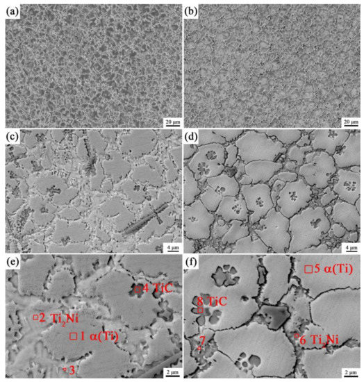 Figure 3 indicates the microstructure of the two coatings under different magnifications. For the coating without Ta, a large number of irregular grains were uniformly distributed in the coating, among which wide and irregular honeycomb-like grain boundaries were connected with each other (Figure 3a). When Ta was introduced into the coating, the irregular grains were transformed into regular equiaxed grains with comparatively smooth edges, accompanied with honeycomb-like grain boundary that was greatly reduced in volume fraction (Figure 3b). A clear observation revealed that some fine dendrites were wrapped in the grains of the two coatings, and their volume fraction increased upon introducing Ta. Figure 3c–f show the images with high magnification. Besides the grains (marked as 1 and 5) and dendrites (marked as 4 and 8), the other two morphological phases could be obviously observed in the grain boundary, corresponding to the raised zones (marked as 3 and 7) and shrunken zones (marked as 2 and 5). EDS was applied to identify the chemical compositions of the abovementioned phases, and the results are shown in Table 2. Zone 1 is rich in Ti (67.04 at.%). Small quantities of Al (9.81 at.%), V (3.51 at.%), Cr (5.18 at.%), Fe (4.25 at.%), Co (4.16 at.%), and Ni (4.49 at.%) were also detected. Besides those elements, Ta was found in Zone 5. Combined with the XRD results, the grains in the two coatings could be confirmed as a α(Ti) solid solution, in which α-Ti with close-packed hexagonal structure played the role of solvent, and other alloying elements acted as solute. Zone 4 is rich in Ti and C, indicating the dendrites could be determined as TiC secondary solid solution. When Ta was introduced in the coating, Ta was involved in TiC, which displaced Ti atoms in the lattice due to their similar atomic radius. The raised zones could be confirmed as α(Ti) due to their similar chemical compositions with the grains. The shrunken zone (Zone 2) in the coating without Ta mainly contained Ti (55.28 at.%) and Ni (11.27 at.%), followed by Al (5.19 at.%), Cr (3.69 at.%), Fe (9.18 at.%), and Co (12.25 at.%). The zone could be identified as Ti2Ni, a secondary solid solution. As mentioned above, the atomic radius values of Ti, Al, and Cr are similar, and the electronegativity values among the three elements are about the same (Ti: 1.54, Al: 1.61, and Cr: 1.66), suggesting that the Al and Cr atoms could replace the Ti atoms in the Ti2Ni lattice. In the same manner, the Ni atoms in Ti2Ni could be substituted for Co and Fe atoms due to the close values in atomic radius and electronegativity (Ni: 1.24 Å in atomic radius, 1.91 in electronegativity; Co: 1.26 Å in atomic radius, 1.88 in electronegativity; and Fe: 1.27 Å in atomic radius, 1.83 in electronegativity). In addition, the atomic ratio of Ti + Al + Cr to Ni + Co + Fe was calculated as 1.96: 1, relatively close to 2:1. Similarly, the shrunken zone (Zone 6) in the coating with Ta was Ti2Ni. Based on the above analyses, the microstructure consisted of primary α(Ti), eutecticum (α(Ti) + Ti2Ni), and reinforcement TiC. The increase in the number of TiC and eutecticum is closely associated with Ta.