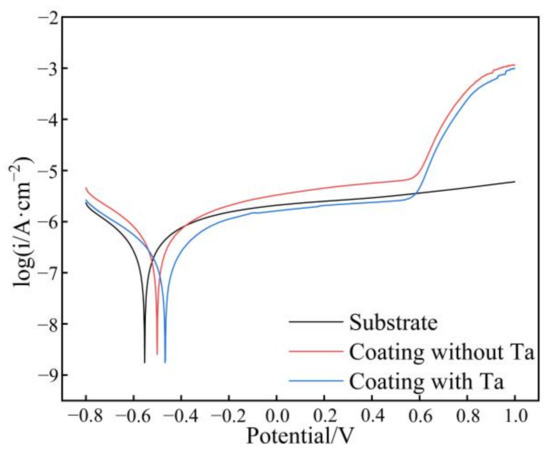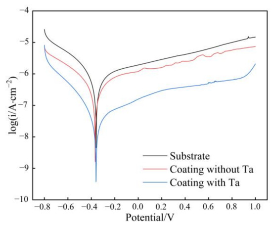 - The addition of Ta obviously alleviated corrosion on the surface in neutral and alkaline environments. The Ecorr and icorr for the coating with Ta in these environments were as follows: Ecorr: −0.360 V, icorr: 3.507 × 10−7 A·cm−2 in a neutral environment; and Ecorr: −0.468 V, icorr: 7.70 × 10−7 A·cm−2 in an alkaline environment.