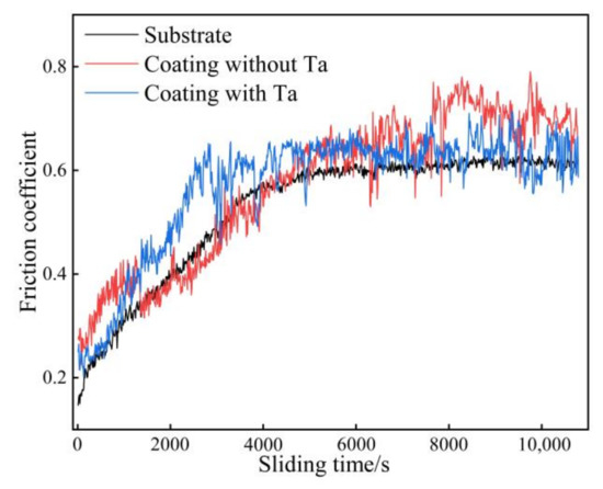 Figure 10 indicates the change in friction coefficient of the coatings and the substrate with sliding time in NaOH solution (pH = 11). The friction coefficient of the substrate maintained a rising trend with the increase in sliding time without the entrance into the stable wear stage, indicating that the substrate remained in the initial wear stage until the end of the test, which may be due to the strong causticity of the solution. The friction coefficient of the coatings fluctuated widely until the sliding time reached 75 min and then entered the relative stable stage. The average friction coefficient of the coatings with Ta was about 0.419, 36.71% less than that of the coating without Ta (about 0.662).