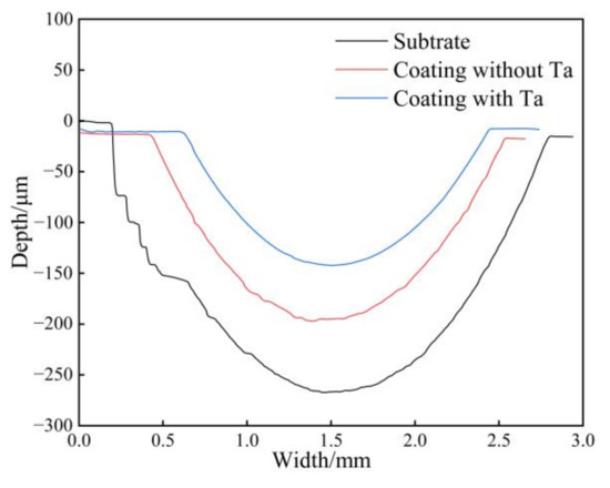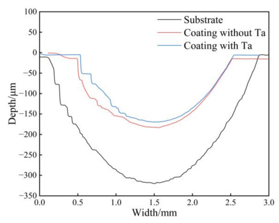 Figure 7 indicates the change in the friction coefficient of the coatings and the substrate with sliding time in neutral environment (3.5 wt.% NaCl solution, pH = 7). Two stages were clearly observed during the friction. The first stage is called the initial wear stage, in which the friction coefficient increased dramatically. When the counterpart YG6 started to come into contact with the coating, the contact mainly occurred among the protrusions between the two and greatly increased the motion resistance of the friction pair, causing an increase in the friction coefficient with the sliding time. With the protrusions peeled off from the surface, the contacting area gradually increased, resulting in the wear entering into the stable stage, in which the friction coefficient fluctuates in a small range, showing relative stability. In the stable wear stage, the friction coefficient of the coating without Ta clearly fluctuated more violently than the other two, and the average value was also the highest (coating without Ta: 0.715, coating with Ta: 0.645, and substrate: 0.613). The wear profiles of the substrate and the coatings are indicated in Figure 8, and the corresponding wear volumes and wear rates are shown in Table 5. The wear rates of the coatings were clearly lower than that of the substrate, reduced by 14.8% and 64.5%. As far as the coatings are concerned, the introduction of Ta resulted in the wear rate of the coating being reduced by 58.3%, and the wear rate for the coating without Ta is 4.7458 × 10−4 mm3·N−1·m−1. Feng et al. [20] prepared Ti-Al-(C, N) composite coatings on the surface of TC4 by laser cladding and investigated the tribocorrosion of the coatings in artificial seawater. When the load was 20 N, similar to the load in the present paper, the wear rate was calculated to be 1.04 × 10−3 mm3·N−1·m−1. The coating fabricated in the present paper obviously showed a better tribocorrosion resistance property.