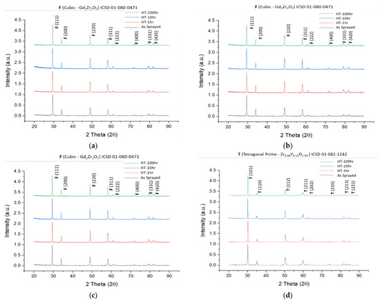 XRD of as-sprayed and heat-treated TBC samples (a) double layer, (b) triple layered, (c) composite layer, (d) single layer.