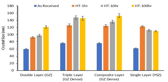 In addition, all peaks appear to be sharper after treatment indicting crystallite growth (Figure 8). For DL-TBC samples, crystallite growth in GZ layer is observed to be 60 ± 1.3 nm at the as-sprayed condition and increased to be almost doubled (121.1 ± 3.4 nm) after 100 h. The same behavior was detected for TL-TBC samples as the crystallite size of GZ dense layer was measured to be 76 ± 1.7 nm for the as-sprayed condition and increased approximately two fold after heating for 100 h, 145.6 ± 5.4 nm. The crystallite size of CL-TBC specimens (GZ dense layer) for the as-sprayed and the 100 h treatment condition were determined to be 76.2 ± 1.7 nm and 152.5 ± 5.4 nm, respectively. For the SL-TBC samples, the crystallite size of YSZ layer (as-sprayed condition) was 61.8 ± 0.8 nm and increased to 122.6 ± 2 nm after 1 h, and no significant changes afterwards.