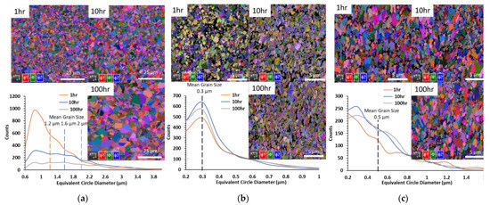For TL-TBC (Figure 11a–c), the grain size determined through EBSD analysis for the bond coat showed increased trends corresponding to the extended heating duration as shown in the line graph in Figure 11a. The average grain size measurement (represented by dashed lines in Figure 11a) obtained for the 1, 10, 100 h conditions are 1.2 ± 0.6 µm, 1.6 ± 0.8 µm, and 2.3 ± 1.4 µm, respectively. The metallic bond coat experienced grain coarsening that confirmed by the reduction in the count of indexed grains for the same recorded EBSD mapping area (grain count was 3947 and 1088 at 1 and 100 h, respectively), see Figure 11a. Mostly, the bond coat attained improved the crystalline structure after being thermally treated for 1 h, and further exposure for the thermal load contributed to the growth of the formed gains. The grain size distribution for the YSZ ceramic layer revealed insignificant changes between 1 and 10 h conditions; however, at the 100 h condition, a noticeable increase in the number of indexed grains were detected as presented in the line chart in Figure 11b. The average grain size for the YSZ layer was determined to be 0.3 µm. The grain size distribution (line graph, Figure 11c) for the GZ layer demonstrated an unnoticeable effect for the elongated exposure to heating load. However, it can be seen clearly from the Euler maps that grain growth is significant at the 100 h treatment condition. Also, the 10 h map shows black detected regions (unindexed grains), that may result from localized residual stresses. These unindexed regions might contribute to the unrealistic grain size distribution. The average grain size for the GZ layer were measured to be 0.5 µm, represented by the dashed line in Figure 11c. The orientation analysis from Euler maps, demonstrated that the YSZ and GZ grains have no preferred orientation.