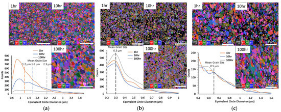 After heating, the TBC samples exhibited improved crystallinity, and EBSD mapping can be generated. The grain size distribution and orientation based on Euler angle maps for the DL-TBC after exposure for thermal loading of 1150 °C for 1, 10, and 100 h are shown in Figure 10. For the bond coat (Figure 10a), it was found that average grain size (dashed line) increased from 1.2 ± 0.6 µm to 1.6 ± 0.8 µm and 2 ± 1.3 µm, respectively. Also, the count of detected grains shown in the line graph (see Figure 10a), reduced from increased treatment duration from 1 h (4356 grain) to 100 h (1349 grain), is another indication for the induced grain-growth mechanism. We can conclude that application of thermal loading to the DL-TBC contributed to grain growth and was a prime mechanism aside from the grain formation mechanism. Furthermore, the EBSD maps obtained for the BC showed a balanced phase distribution of the β-phase and γ/γ’-phase; however, at the 100 h condition, a noticeable increase in the γ/γ’-phase percentage was detected. This phase transformation from β to γ-phase is accompanied with volume changes that can contribute to the failure of the TBC system [50]. For GZ/YSZ (Figure 10b,c), new grain formation is the dominant mechanism rather than grain growth as the average grain size (dashed line) remains at 0.3 µm and 0.5 µm, respectively. While the count of grains captured by EBSD scanning for YSZ at 1, 10, and 100 h increased from 1455 to 1740 and 1652 grains, respectively, the GZ grain count for 1, 10, and 100 h treatment duration were found to be 1105, 1344 and 1327, respectively. The total grain counts for ceramic layers were notably increased after 10 h and then stabilized after 100 h.