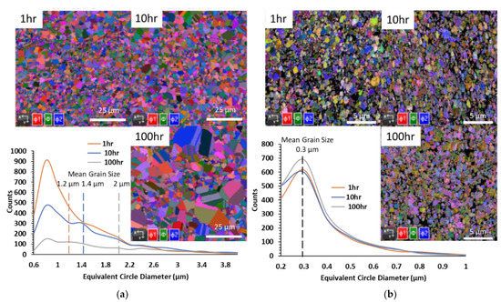 EBSD analysis was performed on a Symmetry S2® EBSD detector (Oxford Instruments, Abingdon, UK) to observe the grain size evolution, grain orientation, and phase distribution at a step size of 0.03–0.15 µm, and minimum of 800 grains per map was measured.
