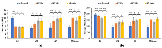 For TL TBC (Figure 15), similar behavior is observed in the bond coat as the previous one. Generally, there was an increase in hardness measurement for the ceramic layers (YSZ, GZ, and GZ density) as compared to the as-sprayed state as shown in Figure 15a. For example, the hardness of the YSZ layer increased from 5.01 GPa (as sprayed) to 8.87 GPa (10 h treatment), whereas there was an unnoticeable change in hardness for the 100 h treatment sample referred to in the 10 h specimen. For the GZ layer, the hardness was raised to 8.7 GPa after the 1 h heating condition (as-sprayed hardness = 5.31 GPa), whereas elongated exposure to the heating temperature (i.e., 10 and 100 h) had an unremarkable effect on determined hardness values. The hardness measurement for the GZ density fluctuated between 5.48 GPa and 11.02 GPa. The Young’s modulus of the ceramic layers (YSZ, GZ, and GZ dense) increased after thermal treatment compared to the as-sprayed state (see Figure 15b). The elastic modulus for YSZ and GZ layer went up from 92.9 GPa to 122.8 GPa and from 101.6 GPa to 144.5 GPa at as-sprayed and 1 h treatment conditions, respectively. Whereas no significant change was detected for 10 and 100 h on elastic modulus of YSZ and. The Young’s modulus values of the GZ dense layer varied between 93.9 GPa and 160.3 GPa.
