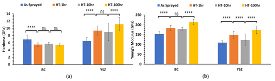 For SL-TBC (Figure 17), the observation of the changes occurred in hardness and elastic modulus measurements for both the metallic BC layer and the YSZ ceramic layer matches with the other coating systems discussed before. The detected increase in the mechanical characteristics of the ceramic layers can be attributed to the occurred healing of micro-cracks through induced sintering at high temperature along with the developed residual stresses within the ceramic layer due to thermal expansion mismatch [52,53].