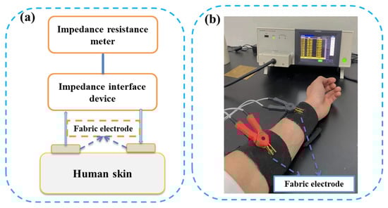 The contact impedance test between the fabric electrode and the skin. (a) Schematic diagram. (b) Test diagram.