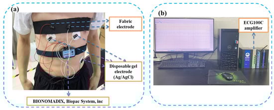 The room temperature was 25 ± 1 °C and the relative humidity was 65 ± 2%, during the ECG signal measurement for this experiment. The BIOPAC MP160 multi-channel (16-channel) physiological recorder is mainly used to measure the human ECG signals. The ECG2-R ECG module then collects those ECG signals, and finally the test results are output by the display screen. As shown in Figure 4a, before the test, an elastic bandage with a width of 6 cm and a length of 76 cm with adjustment buckles at both ends and Velcro stitched to the back, is used to bind the electrode in a specific position on the body, and a pair of disposable gel electrodes (Ag/AgCl) are attached below the corresponding positions of the electrodes. Prior to fixing the ECG belt, the contact surface of the fabric electrode and the skin needs to be coated with different media reagents. During the test, both the bound electrode and the disposable gel electrode (Ag/AgCl) are connected to the ECG signal collector (BIONOMADIX, Biopac System, Inc., Goleta, CA, USA), the ECG signal collector is wirelessly connected to the ECG100C amplifier, and the acquired ECG signal is processed and fed back to the computer (Figure 4b).