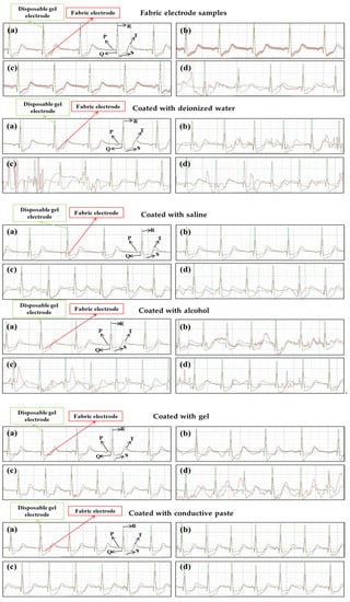 The advantage of the fabric electrodes is that they can be integrated into normal clothing, thereby allowing them to monitor the dynamic electrocardiogram throughout the wearer’s daily life [9]. Since the fabric electrode is in direct contact with the skin when in use, no conductive gel is required. However, under dynamic conditions, there will be interaction between the electrode and the skin, causing motion artifacts. The use of different media reagents to coat the surface of the fabric electrode, not only moisturizes the skin, but also acts as an electrolyte to fill the gap between the electrode and the surface of the skin, effectively reducing the movement artifacts generated by the ECG signals during exercise. Figure 6 presents the ECG readings from the disposable medical gel electrodes and fabric electrodes in different states, measured after the electrode surface has been coated with different media reagents (deionized water, saline, alcohol, gel, and conductive paste). The green waveform diagram is the ECG measured by the disposable gel electrode, while the red is the ECG measured by the fabric electrode. The correlation coefficient between the ECG patterns corresponding to the disposable gel electrode and the fabric electrode are shown in Table 1.