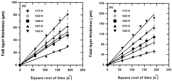 | ASP®2012 | Powder | 1123–1223 for 2–6 h | 314.716 (FeB + (Fe2B) | Parabolic law | [41] |