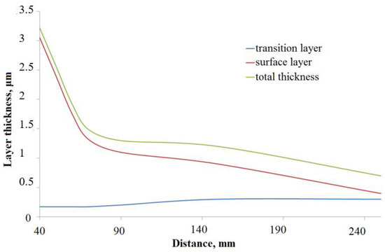 With an increase in the distance, other conditions being equal, on the one hand, the thickness of the deposited zones diminishes (Figure 5), since more of the sprayed substance diverge to the sides from the main sputtering axis without hitting the substrate; on the other hand, the transition zone thickness rises, which may be due to the higher flux density of the sprayed material particles at a smaller distances, faster and evenly settling on the interface and less penetrating into the base material. The summary layers thickness practically does not change at a distance of 80–150 mm and decreases at a greater distance. As the existence of a significant transition zone is a presumed cause for high adhesion of the newly deposited surface to the base material, and this surface must be adapted to the mechanical behavior of the substrate, and taking into account surface microdefects at short length between the substrate and the sputtered target, distances within 100–150 mm are more optimal.