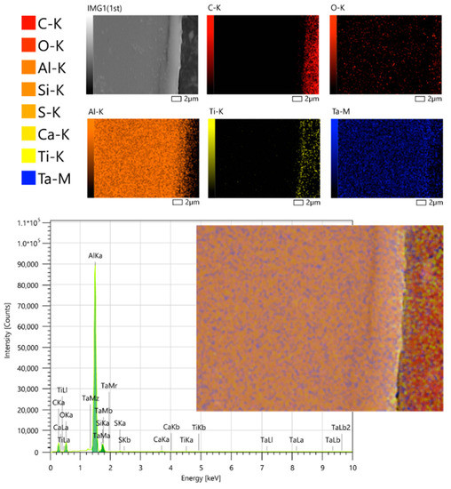 Figure 11. Distribution of elements in a cross section of a composite material with a tantalum–titanium surface layer, created in 30 min at 400 V and 865 mA with a distance of 250 mm (the thickness is 0.4 µm), on an aluminum substrate.