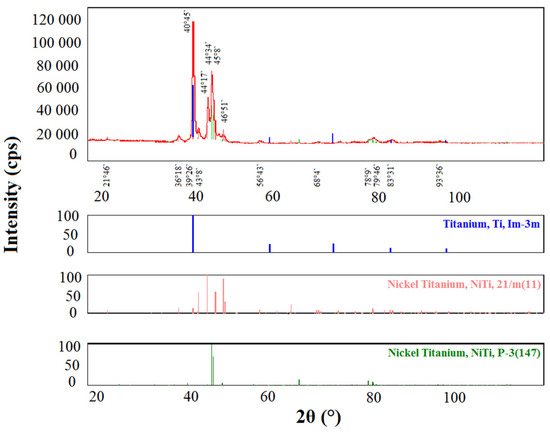 In the case of X-ray phase analysis of a titanium surface layer, regardless of its thickness, production parameters and the nature of the underlying substrate, only the beta phase (cubic crystal lattice) is observed, and this composition was not identical to the cast sputtered target phase composition (alpha). An example is shown in the Figure 17, the main peaks correspond to the phases: Ti—Im-3m: 39°26′, 83°31′; B-19 NiTi—21/m(11): 21°46′, 36°18′, 39°26′, 40°45′, 43°8′, 44°17′, 45°8′, 46°51′, 56°43′, 83°31′; R NiTi—P-3(147): 39°26′, 44°34′, 45°8′, 46°51′, 78°9′, 79°46′, 93°36′.