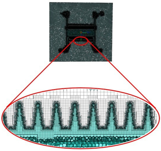 Fluent Mesh was used to create mesh on the geometry, as shown in Figure 2. Poly-hexcore combines polyhedral elements with various meshes. The proximity size and curvature functions were enabled, and 0.0001473 m was set as a minimum surface mesh size with a growth rate of 1.2. Three boundary layers were included to enhance the fluid domain, each with a growth rate of 1.2 and a transition ratio of 0.272. Poly-hexcore cells with 0.0001473 m and 0.0047136 m as their minimum and maximum cell lengths filled the volume mesh, respectively. There were nearly 1.4 million elements in total.
