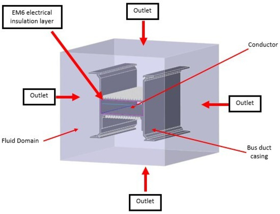 The conductor, heat sink, and fluid domain are the three cell zones that make up the simulation model. Figure 3 shows the cell zones and boundary conditions. The heat sink is made of aluminum, which has an internal emissivity coefficient of 0.09 and a thermal conductivity of 202.4 W/mK. Additionally, the copper conductor’s thermal conductivity was also set at 387.6 W/mK, with its internal emissivity coefficient at 0.05. In the simulation domain, no forced convection mechanism was used; instead, the outlets were defined as 0 Pa (atmosphere pressure). The bus bar conductor was covered in an insulation layer made of polyester electric material. The copper conductor was covered in approximately 0.000125 mm-thin polyester electric with 0.14 W/mK thermal conductivity and 1.34 kJ/kg specific heat. In the fluid domain, the air was defined. The operating parameters were set to 30 °C, operating pressure of 101,325 Pa, and density of 1.225 kg/m3. An essential element of the simulation setup is the heat source. Because it involved heat and electricity, the thermal-electric analysis system was used to study the size of the heat source. For a single volumetric heat source, the heat loss of the bus bar (measured in Joules) was taken into account. Equations (11) and (12) were used to calculate the Joule losses.
