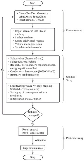 The spatial discretization method used by the pressure-based solver, PRESTO!, is frequently used for natural convection, buoyancy-driven flows, and high Rayleigh number natural convection. To increase the accuracy of the results, the second-order upwind discrimination scheme was chosen to achieve higher-order accuracy at the cell faces. 9.81 m/s2 was chosen to enable gravitational acceleration in the positive-X direction. Using the standard initialization technique, the simulation’s starting temperature was set to 30 °C. In order to simulate heat transfer until steady-state with no temperature fluctuations on the heat sink, a time step size of 0.1 s and 20,000-time steps were selected. The flow chart for the current study’s simulation setup is shown in Figure 4.